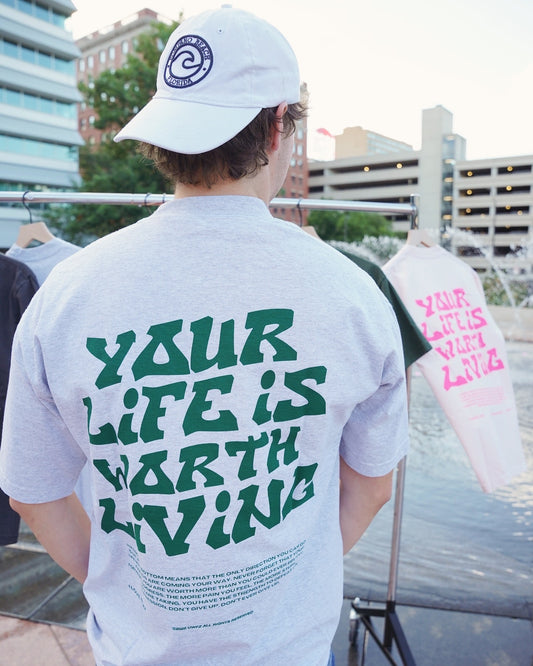 Ash Grey + Green "YOUR LIFE IS WORTH LIVING" Heavy Weight T-Shirt