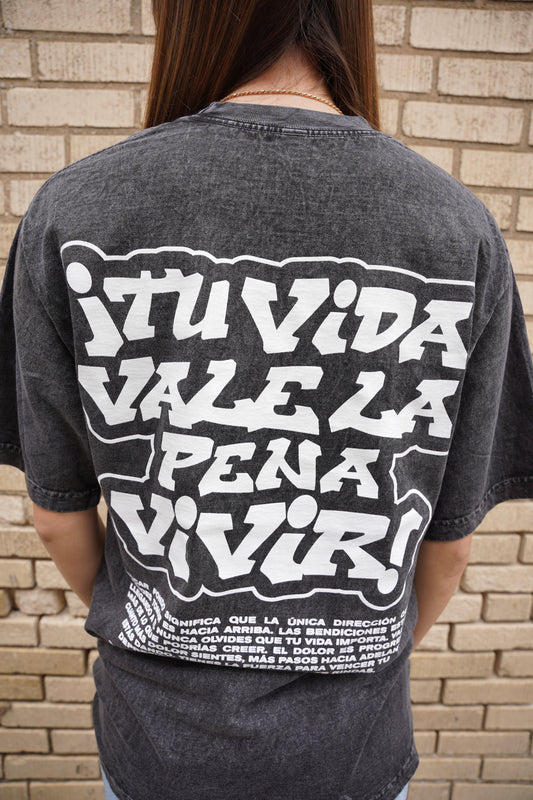 Black Mineral Washed "TU VIDA VALE LA PENA VIVIR" Heavy Weight T-Shirt