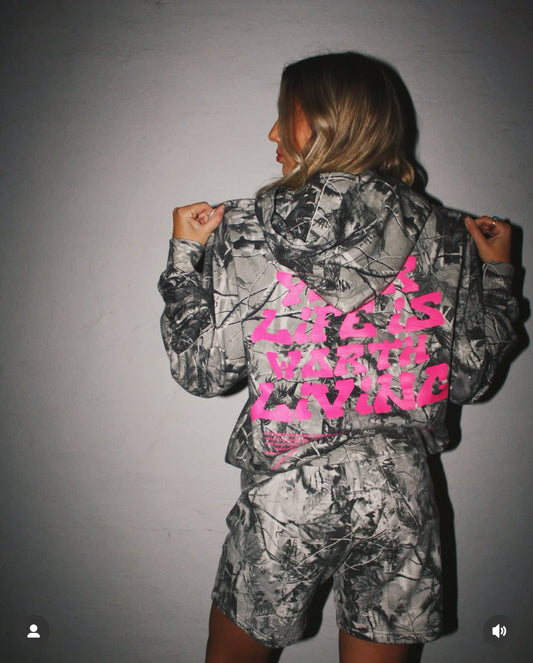 Pink B&W Camo "YOUR LIFE IS WORTH LIVING" Hoodie (Limited - 100% Cotton)