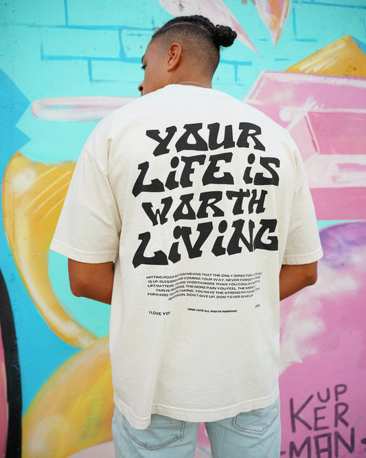 Cream + Black "YOUR LIFE IS WORTH LIVING" Heavy Weight T-Shirt