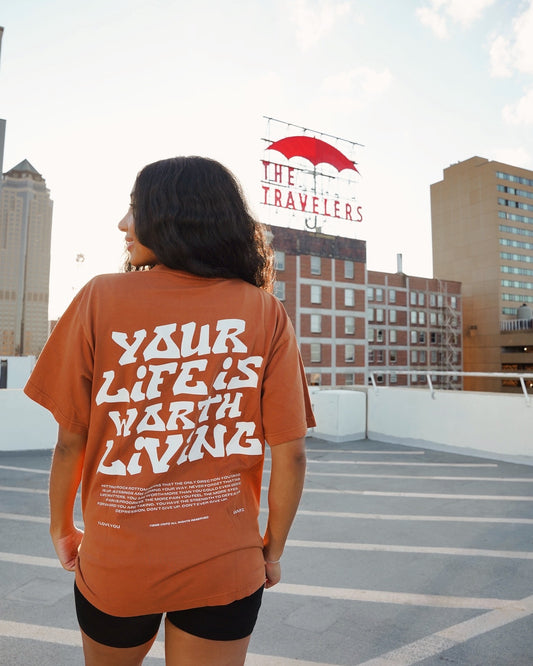 Burnt Orange + White "YOUR LIFE IS WORTH LIVING" Heavy Weight T-Shirt