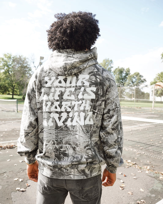 White B&W Camo "YOUR LIFE IS WORTH LIVING" Hoodie (Limited - 100% Cotton)