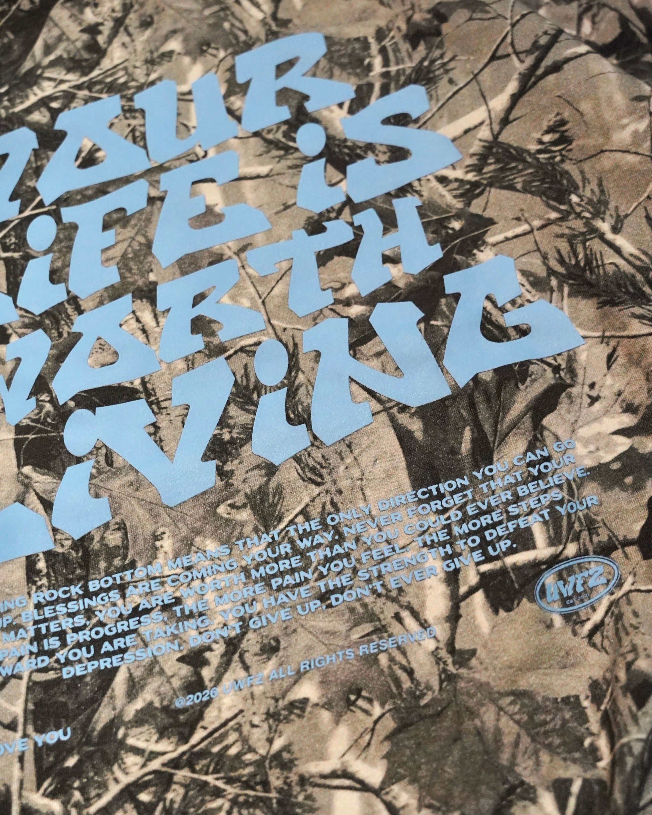Camo + Powder Blue "YOUR LIFE IS WORTH LIVING" Hoodie (100% Cotton)
