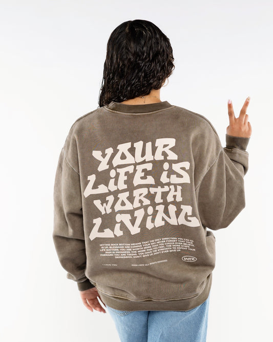 Faded Brown +.Tan Print "YOUR LIFE IS WORTH LIVING" Crewneck