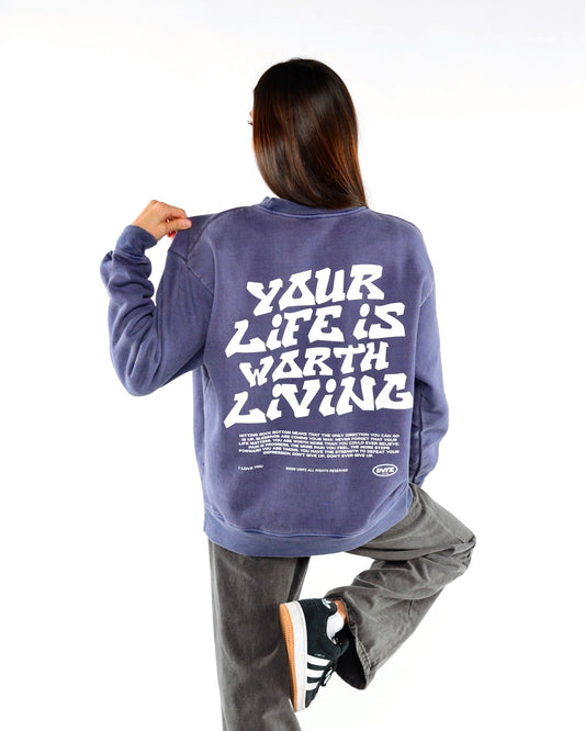 Faded Purple "YOUR LIFE IS WORTH LIVING" Crewneck