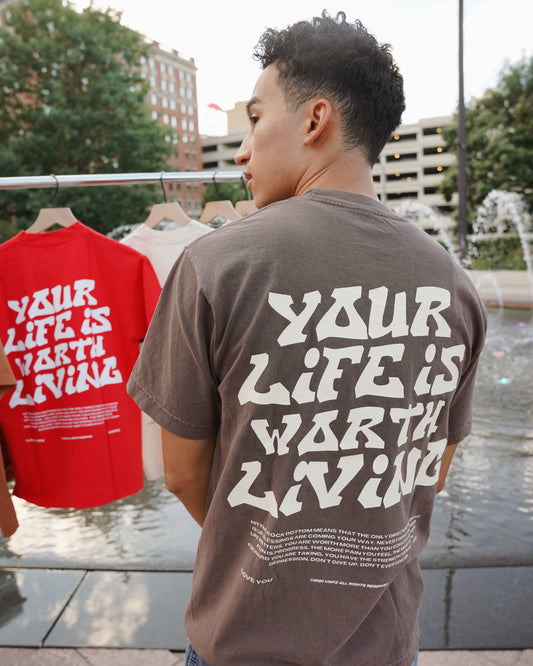Vintage Brown + Cream "YOUR LIFE IS WORTH LIVING" Heavy Weight T-Shirt