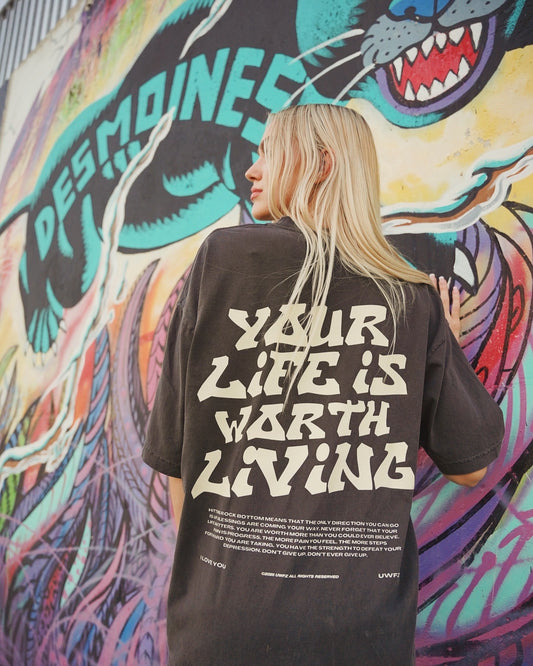 Vintage Black + Cream "YOUR LIFE IS WORTH LIVING" Heavy Weight T-Shirt