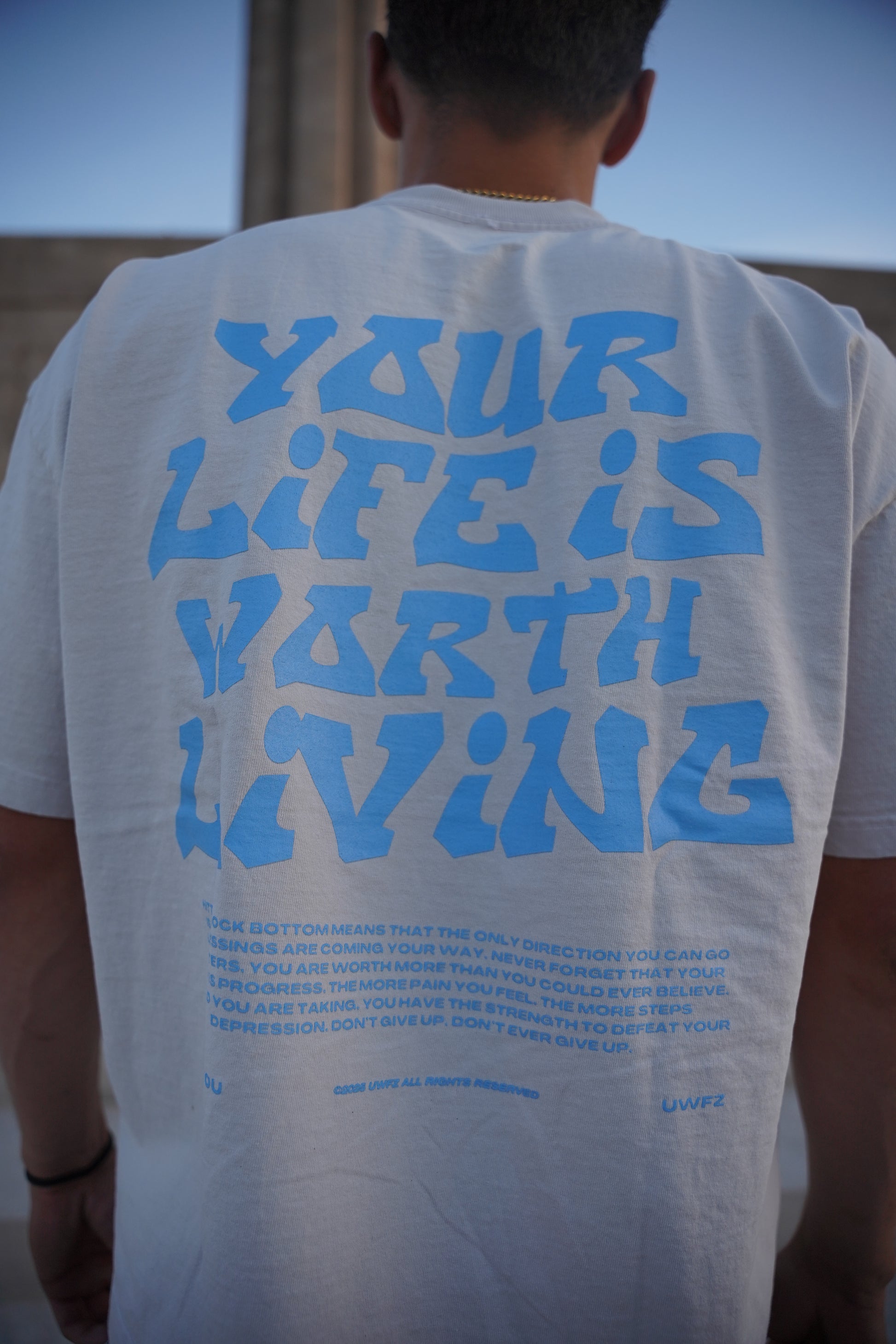Grey + Powder Blue "YOUR LIFE IS WORTH LIVING" Boxy / Crop Cut Heavy Weight T-shirt