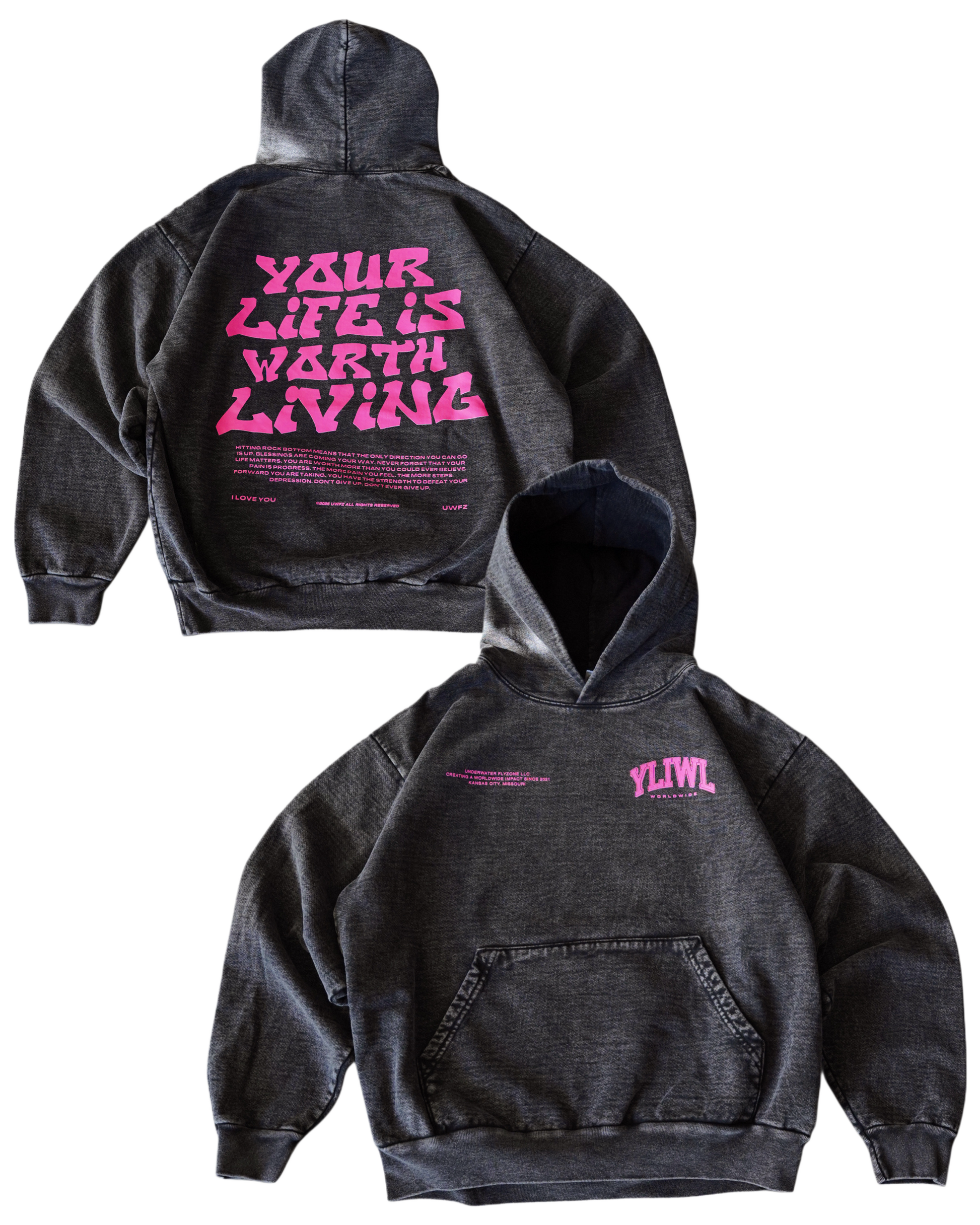 Pink + Mineral Wash Black "YOUR LIFE IS WORTH LIVING" Hoodie (Collectors Edition)
