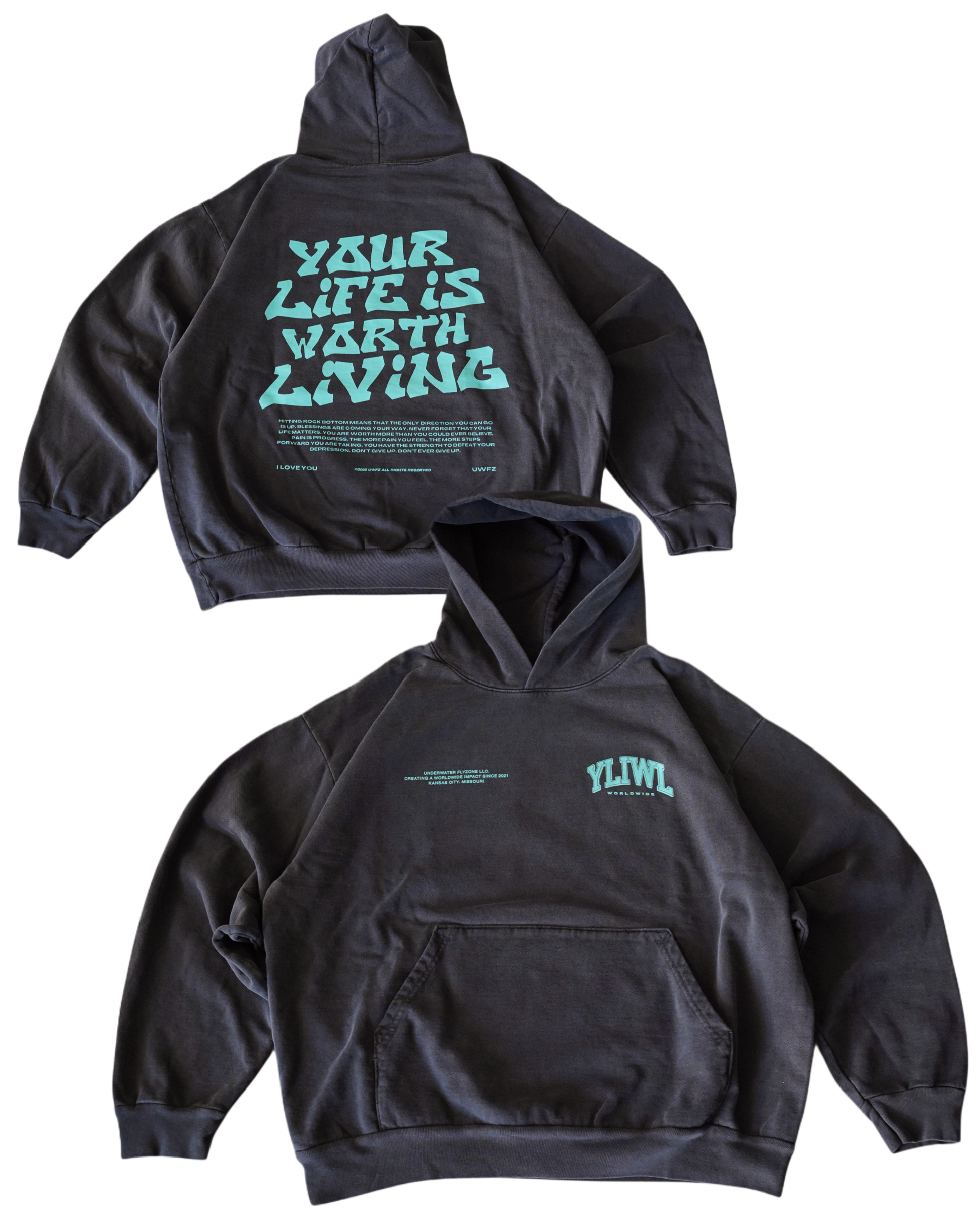 Teal + Vintage Black "YOUR LIFE IS WORTH LIVING" Hoodie (Collectors Edition)