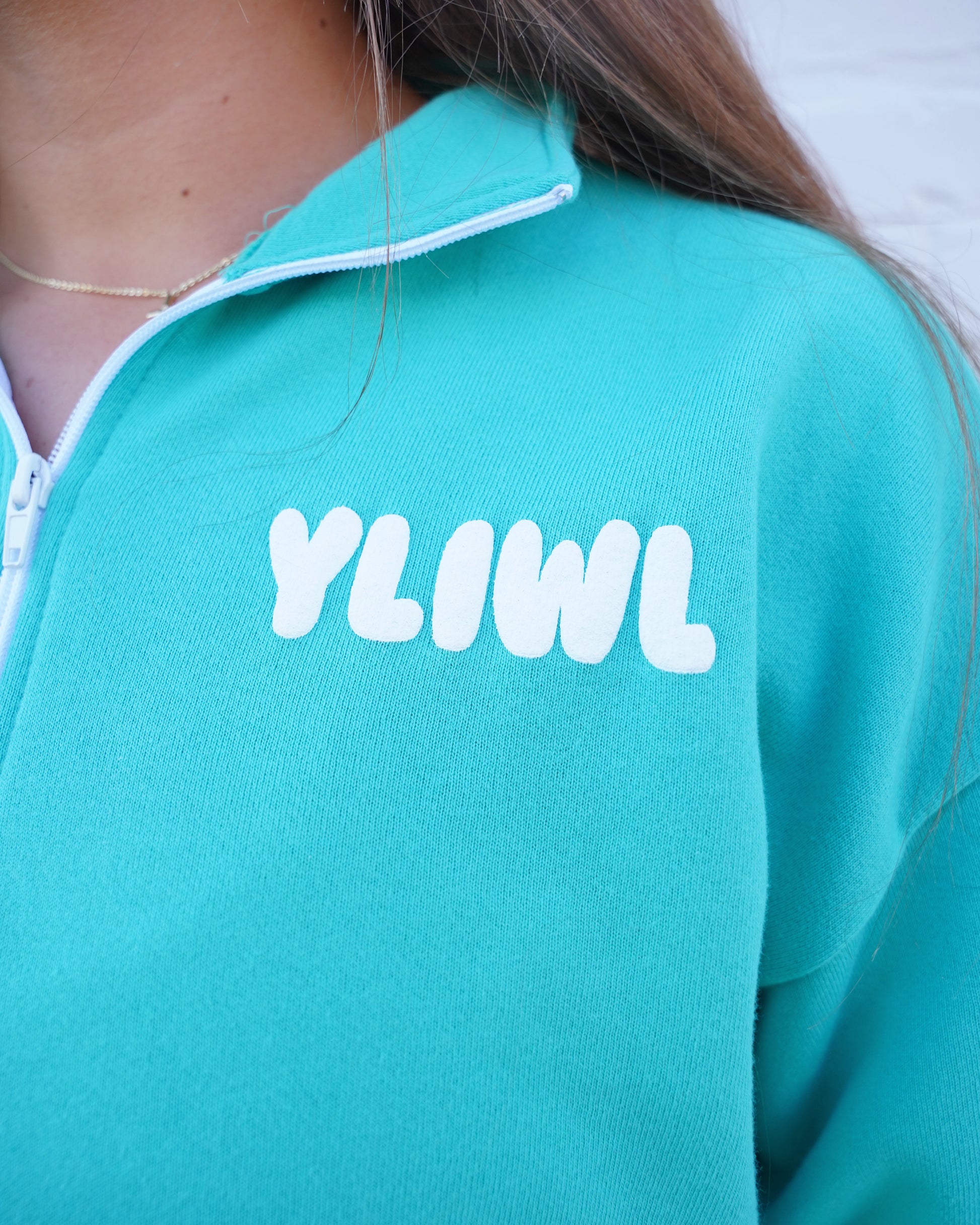 Teal + White PUFF PRINT "YLIWL" Half Zip Cropped Pullover