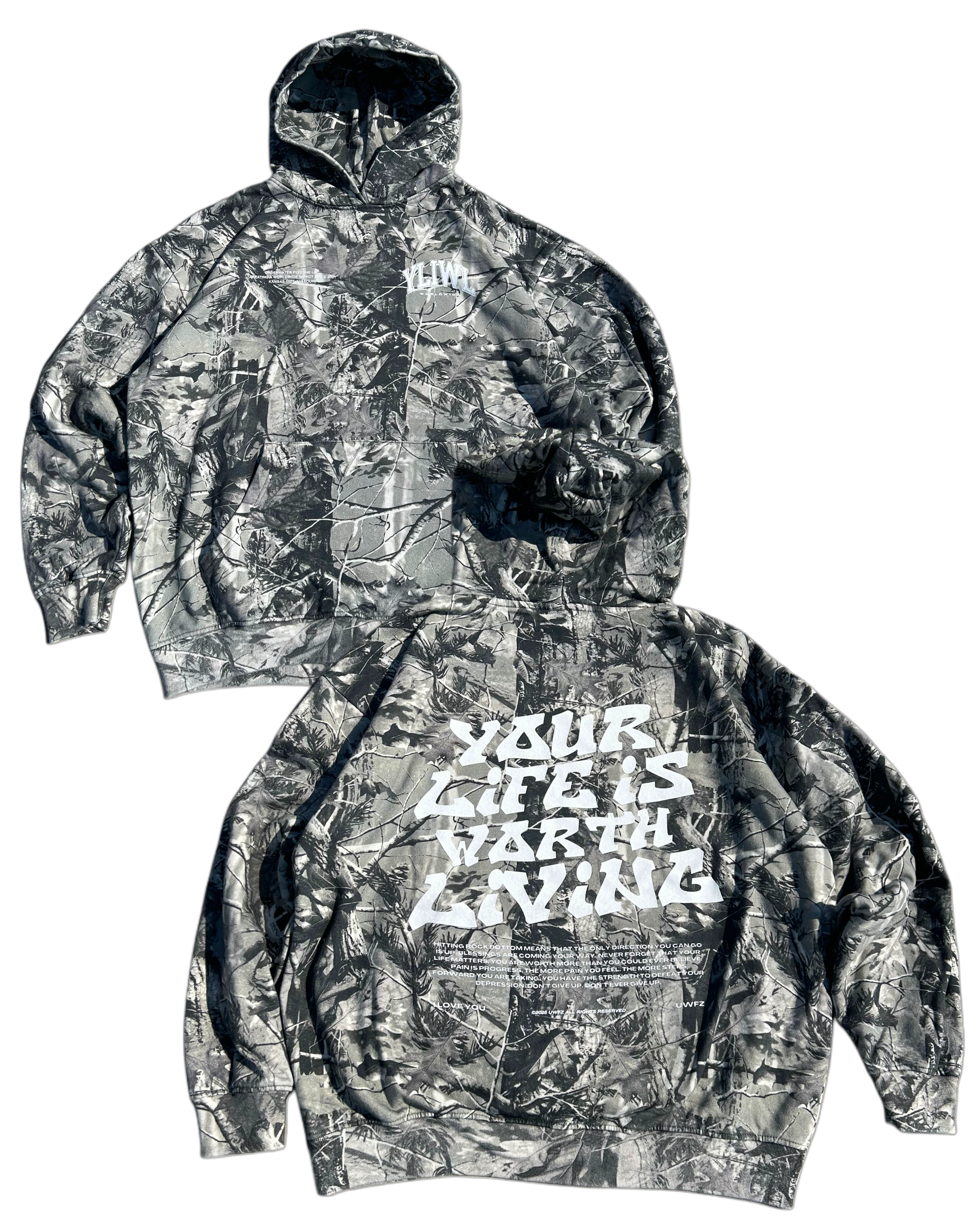 White B&W Camo "YOUR LIFE IS WORTH LIVING" Hoodie (Limited - 100% Cotton)